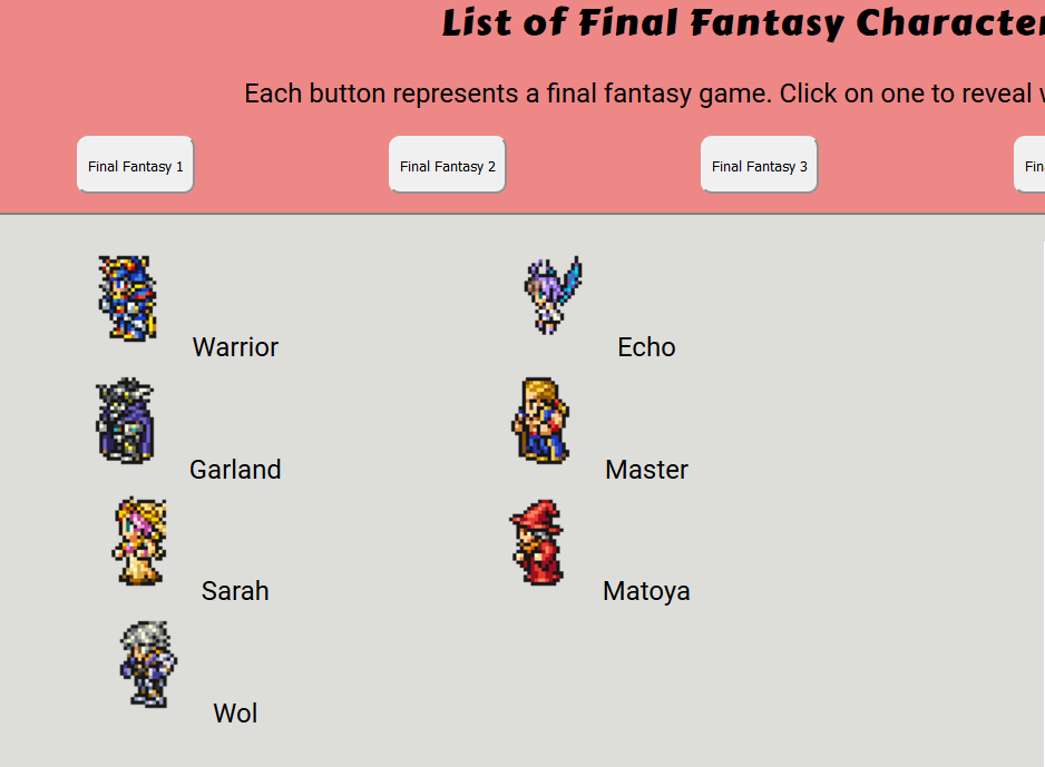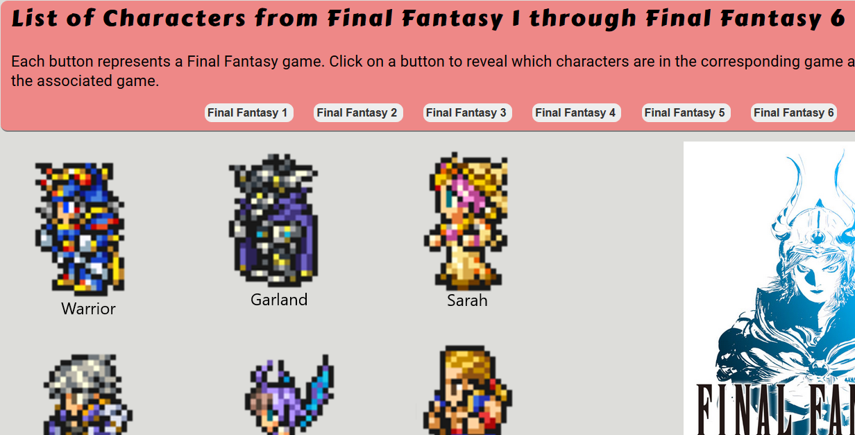 This is a side project based on the video game franchise Final Fantasy. Clicking one of the buttons will show the playable characters from their corresponding games, an promotion image of the game, and play a small sound clip from the game. If there is an audio piece playing when another button is pressed, that audio is stopped, and the new one is played. This is an improved-upon version compared to the one on the right. The JavaScript code was reduced to one function and 25 lines of code, opposed to the many functions and 100 lines of code from the previous assignment. This version also implements audio, which the other version does not.