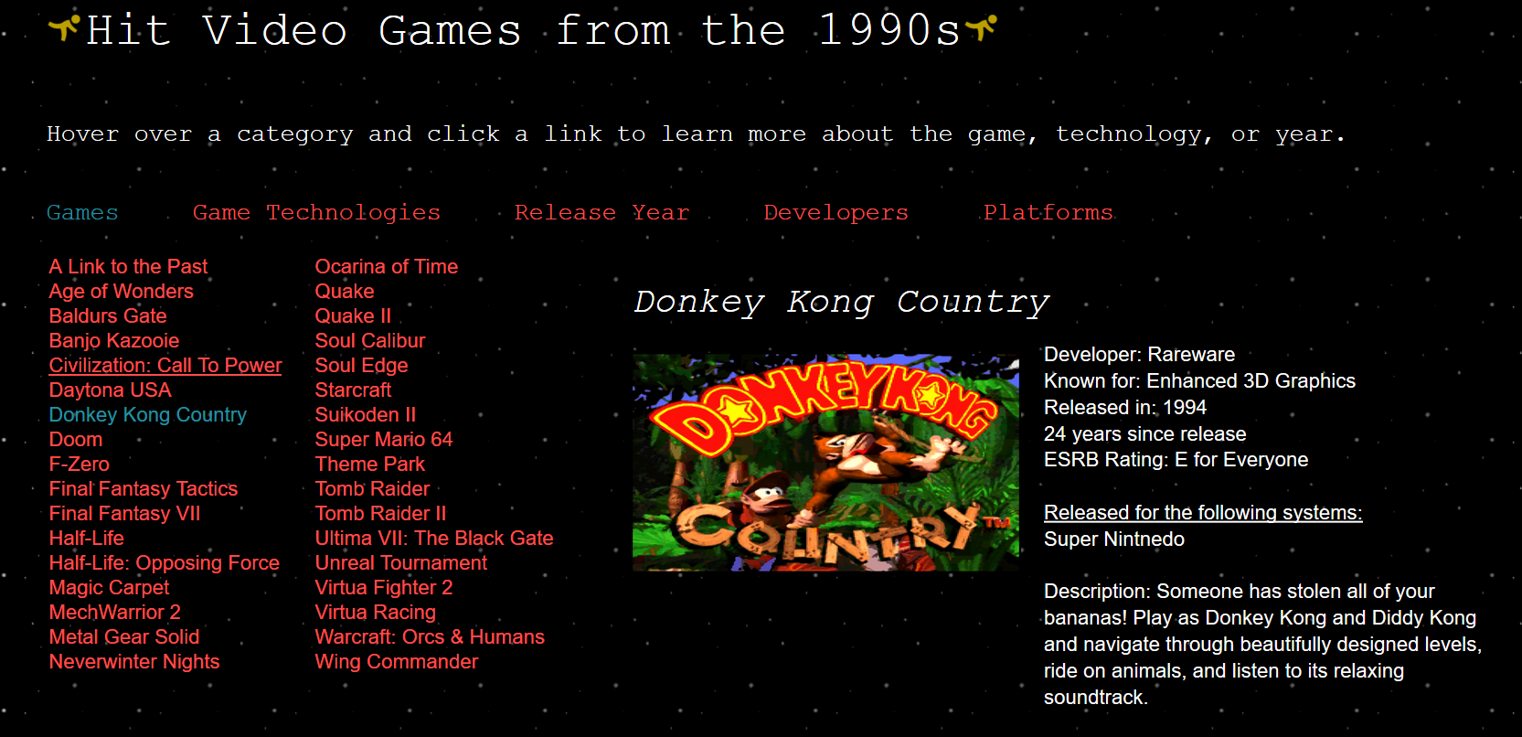 This was my final project for my XML/XSLT class. As the name implies, it was a small database of 1990s video games using XML for storage and XSL for controlling the storage. A lot of information was able to be reused recurisvely using XML attributes. XML information such as 'release year' and 'developers' were assigned unique id numbers, and those numbers would be included in the game entry's XML tag's attribute section. It enabled me to produce the same results with less typing and utilized XML and XSL's potential.
